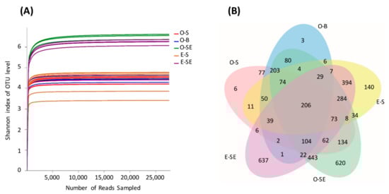 (A) Rarefaction curves base on high-throughput sequencing. (B) A Venn diagram of shared operational taxonomic units (OTUs). O-S: oligotrophic lake, surface waters; O-B: oligotrophic lake, bottom waters; O-SE: oligotrophic lake, sediments; E-S: eutrophic lake, surface waters; E-SE: eutrophic lake, sediments.