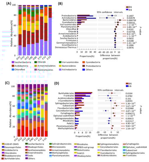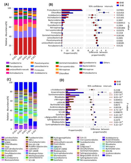 Classification structure and relative abundance in each sediment sample from Lake Basomtso and Lake South (A) at the phylum level and (C) at the order level. At the specific level, “Others” means those that account for less than 1% of the total OTUs in each sample. In the overall distribution of bacteria at the phylum level (B) and at the order level (D) in each sediment sample, the circle values represent the differences between the proportions in Lake Basomtso (red color) and Lake South (blue color). The bar graph on the left represents the proportion of each bacterial phylum’s abundance in the samples. The difference in bacterial abundance was significant with a p-value of <0.05. * p < 0.05; ** p < 0.01; *** p < 0.001. O-SE: oligotrophic lake, sediments, E-SE: eutrophic lake, sediments.