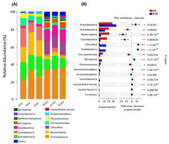 Distribution of major bacterial groups (A) across the sediment and water samples and (B) overall distribution between the sediment and water samples in oligotrophic Lake Basomtso. The circle values represent the differences between the proportions in water samples (red color) and sediment samples (blue color) from Lake Basomtso. Bars on the left represent the proportion of each bacterial phylum’s abundance in the samples. Bacterial abundance differences with a p-value of <0.05 were considered significant. * p < 0.05; ** p < 0.01; *** p < 0.001. O-S: oligotrophic lake, surface waters, O-SE: oligotrophic lake, sediments.
