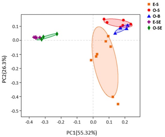 Ordination plot showing the grouping of the water and sediment samples from the two lakes according to their bacterial community structure; the principle coordination was analyzed based on the Bray–Curtis distance matrix. O-S: oligotrophic lake, surface waters, O-B: oligotrophic lake, bottom waters, O-SE: oligotrophic lake, sediments, E-S: eutrophic lake, surface waters, E-SE: eutrophic lake, sediments.