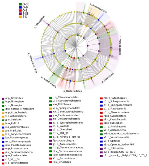 Cladogram showing the phylogenetic distribution of microbial communities associated with the water and sediment samples from the two lakes; lineages with linear discriminant analysis (LDA) values of 4.0 or higher were determined by LEfSe. Differences are represented by the color of the most abundant class. Green (a) represents Lake Basomtso sediments, blue (b) represents Lake Basomtso bottom water samples, red (c) represents Lake Basomtso surface water samples, purple (d) represents Lake South sediments, orange (e) represents Lake South water samples, and yellow (f) represents an insignificant difference. The diameter of each circle is proportional to a taxon’s abundance. Circles from the inner region to outer region represent the phylogenetic levels from domain to genus. O-S: oligotrophic lake, surface waters, O-B: oligotrophic lake, bottom waters, O-SE: oligotrophic lake, sediments, E-S: eutrophic lake, surface waters, E-SE: eutrophic lake, sediments.