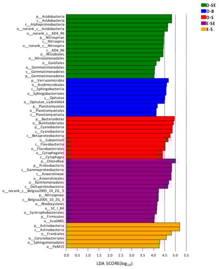 Microbial indicator groups in the two lakes with LDA >4.0. O-S: oligotrophic lake, surface waters, O-B: oligotrophic lake, bottom waters, O-SE: oligotrophic lake, sediments, E-S: eutrophic lake, surface waters, E-SE: eutrophic lake, sediments.