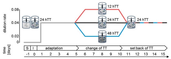 Set up of the bioreactor experiment: six bioreactors were run sterile for 24 h and inoculated with SIHUMIx (1 × 109 cells per species per 250 mL) on day zero. On day one, medium pumps were set to a dilution rate of 0.04 h−1 until day five (adaptation). On day five, the dilution rate was changed to 0.02 h−1 (48 hTTI and II) or 0.08 h−1 (12 hTTI and II) in two bioreactors, respectively (change of TT), and set back to 0.04 h−1 on day 10 to day 15 (set back of TT). By setting the dilution rate to 0.08 h−1/0.04 h−1/0.02 h−1, the medium in the bioreactor was fully exchanged, which resulted in TTs of 12 h, 24 h, and 48 h, respectively. S = sterile run. I = inoculation.