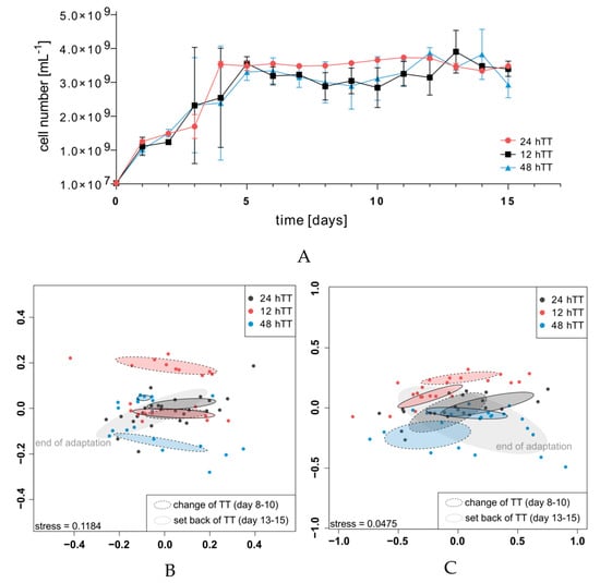 The adaptation phase was followed by the intermediary phase in whichTTs were shifted (day 6 to 10). In two bioreactors, the TT was set to 12 h and, in another set of two bioreactors, it was set to 48 h, respectively. On day 11, the TTs were set to 24 h again for all bioreactors and maintained until the end of the experiment on day 15 (Figure 1). The bacterial cell number was determined (Figure 3A). Compared to the end of the adaptation phase, the cell numbers stayed unchanged for 12 hTT, but decreased slightly at 24 hTT and 48 hTT.