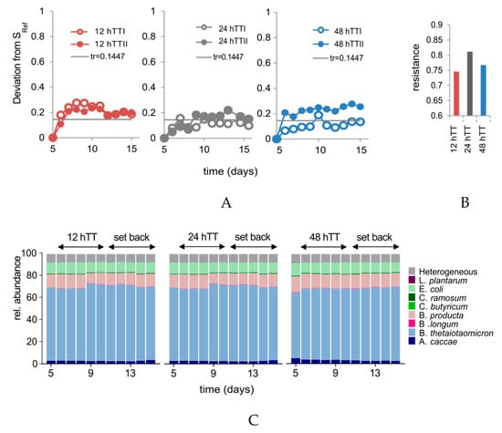 (A) The deviation of SIHUMIx from SRef. Tr = threshold of constancy space. Sref = reference state. (B) Resistance calculation based on flow cytometric data. (C) The stacked bar graphs show the taxa distribution of SIHUMx (12 h/24 h/48 h, n = 2) based on the abundance of species-specific proteins during the phase of changed TT and during the set back of TT afterward.