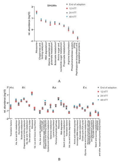 Functional differences were found for specific pathways in the KEGG sub-roles: translation, folding, sorting and degradation, membrane transport, and amino acid and glycan metabolism, which are relevant for DNA replication and cell division (Figure 5A). During cell division, bacterial cells need to replicate two main components: the chromosomes and the peptidoglycan cell wall [43]. In fact, the glycan metabolism of SIHUMIx was affected differently during varying TTs. During the 12 hTT, the relative protein abundance of the pathways peptidoglycan biosynthesis and degradation proteins decreased. It is probable that, at 12 hTT, more alternative carbon and nitrogen sources were available and cell wall synthesis could be maintained without energy consumption recycling of peptidoglycans [44], but it is still unknown exactly how peptidoglycan chains are synthesized [43]. When bacteria are shifted from low to high nutrient availability, the expression of ribosomal RNA and ribosomal proteins is likely to accelerate [45]. Hence, in this study, the relative abundance of the proteins related to the KEGG pathway ribosome of SIHUMIx was higher at 12 hTT compared to 48 hTT. Apparently, this shift was slightly higher for B. thetaiotaomicron than B. producta. For other members of SIHUMIx, changes in relative abundances of ribosomal proteins were not assigned.