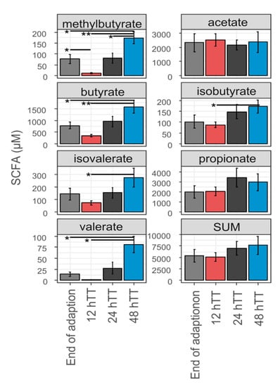 The absolute concentrations of butyrate (p = 0.0049) and valerate (p = 0.0404) were lower at 12 hTT compared to 48 hTT. This was also true for the BCFA methylbutyrate (p = 0.0012), isobutyrate (p = 0.039), and isovalerate (p = 0.0381), which decreased at 12 hTT compared to 48 hTT. The amount of total SCFA and the concentration of acetate and propionate were not affected by changes in TT.