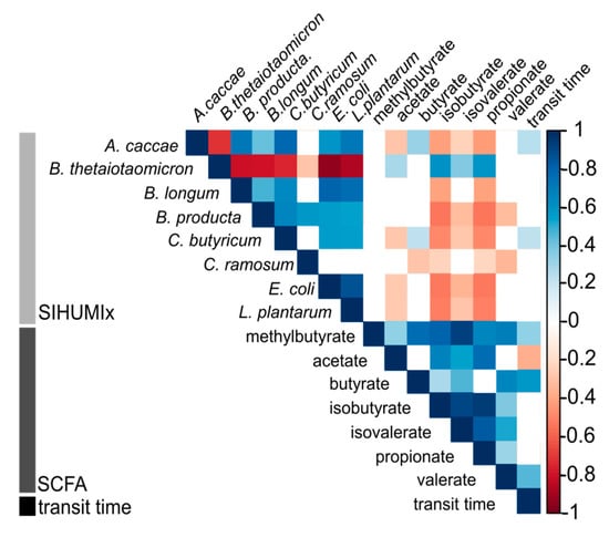 Saccharolytic activity in the human intestine mainly concerns the breakdown of carbohydrates via the Embden-Meyerhof-Parnas pathway. At first, glucose is metabolized to pyruvate and further into SCFA. Genera that produce SCFA are known to be primarily Bacterioides spp., Lactobacillus spp., and Bifidobacterium spp. [8]. The correlation analysis of the SIHUMIx species abundance with the absolute concentrations of fermented SCFA products revealed that propionate could be strongly associated with B. thetaiotaomicron but not with L. plantarum or B. longum (Figure 7).