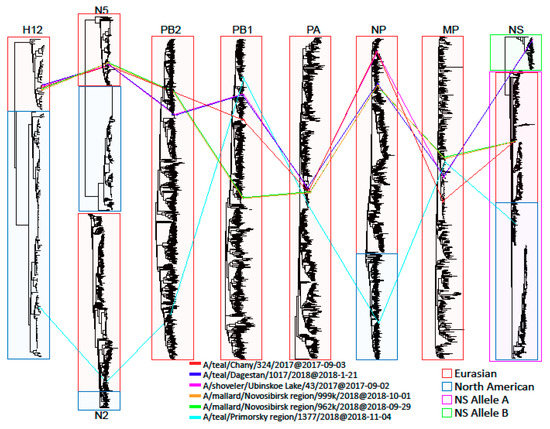 Additionally, we constructed five eight-segment-merged maps based on phylogeographic analyses for each segment (Supplementary Materials, Figure S4). The results also showed that A/1377-Amer takes its HA, NP and NS segments from the American lineage (closest relatives isolated in 2016–2017 in California, Delaware, Alberta), while the five other segments likely originate from viruses in the Far-East Region (closest relatives isolated in Japan, 2016 to 2017). The geographical distribution of the NS segments (A or B allele) suggests that the closest viruses of the B allele were isolated since 2010 across Eurasia (Sweden to Bangladesh), while the closest viruses to the A allele correspond to recent HxNy isolates in neighboring areas (Chany, Hungary, Georgia, Mongolia since mainly 2015). The genetic connection of the AIVs isolated from the Novosibirsk region to the AIVs across the Eurasian continent could be explained through the overlap in multiple migration flyways, including the Black Sea–Mediterranean Flyway, East Africa–Western Asia Flyway, Central Asia Flyway, and East Asia–Australia Flyway in the Novosibirsk region (Supplementary Materials, Figure S3).