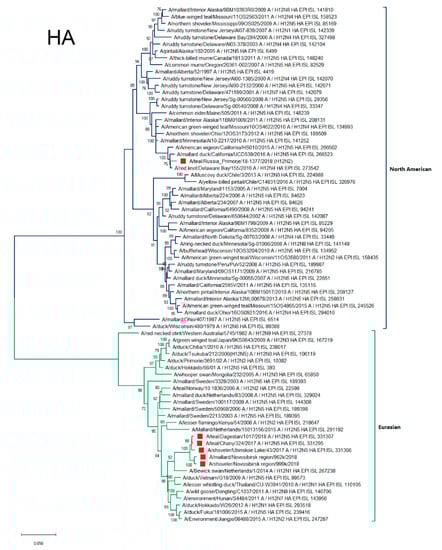 Phylogenetic tree of the hemagglutinin (HA) gene of Avian Influenza Viruses. The tree was constructed using MEGA X software with the Maximum likelihood estimation algorithm (general time reversible (GTR)+G model) and bootstrap analysis with 500 iterations. Russian H12N2 and H12N5 viruses are indicated using red squares.