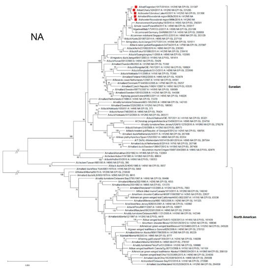 Phylogenetic tree of the neuraminidase (NA) gene of AIVs. The tree was constructed using MEGA X software with the ML algorithm (GTR+G model) and bootstrap analysis with 500 iterations. Russian H12N5 viruses are indicated using red squares.