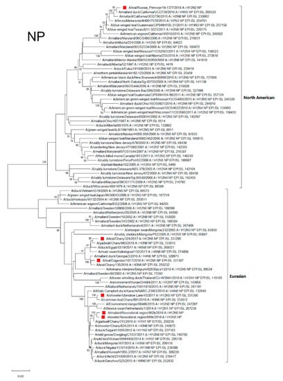 Phylogenetic tree of the nucleoprotein (NP) gene of AIVs. The tree was constructed using MEGA X software with the ML algorithm (GTR+G model) and bootstrap analysis with 500 iterations. Russian H12N2 and H12N5 viruses are indicated using red squares.