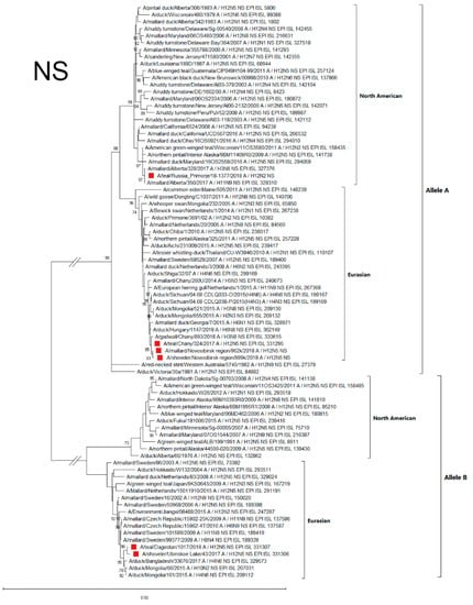 NS allele A of Russian strains belonged to both genetic lineages. The NS gene of the A/1377-Amer strain belonged to the North American lineage, while the NS genes of A/324, A/962, and A/999 were similar to each other and belonged to the Eurasian lineage (related NSs were found in both European and Asian parts of Eurasia) (Figure 5).