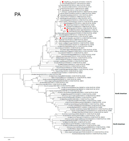 Phylogenetic tree of the PA gene of AIVs. The tree was constructed using MEGA X software with the ML algorithm (GTR+G model) and bootstrap analysis with 500 iterations. Russian H12N2 and H12N5 viruses are indicated using red squares.