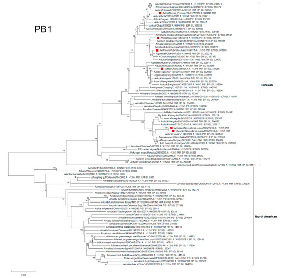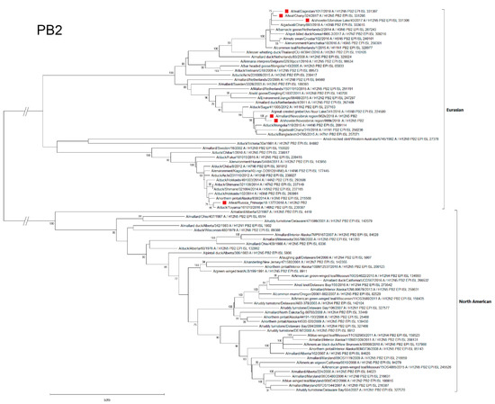 According to the Polymerase Basic Protein 2 (PB2) segment phylogenetic analysis, Russian H12Nx strains were differentiated into three subgroups that belonged to the Eurasian genetic lineage (Figure 8).