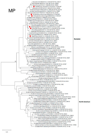 Matrix Protein (MP) segments of all Russian H12Nx AIVs belong to Eurasian genetic lineage, and subdivided into several phylogenetic subgroups (Figure 9).