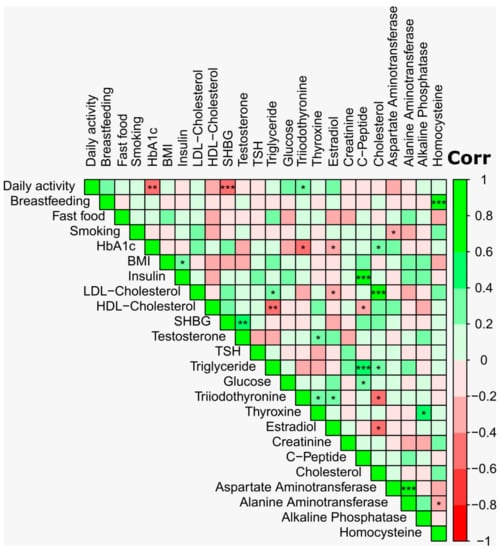 Spearman’s correlation analysis was applied for the pairwise analysis of plasma biochemical profile and demographic characteristics. The Benjamini–Hochberg false discovery rate (FDR) was used to perform multiple comparisons of the p-values. The color intensity shows the strength of correlation. Asterisks in each box indicate the corrected p-value; *** ≤ 0.001, ** ≤ 0.01 and * ≤ 0.05. Analyses were performed using the corrplot package in RStudio version 3.5.0.