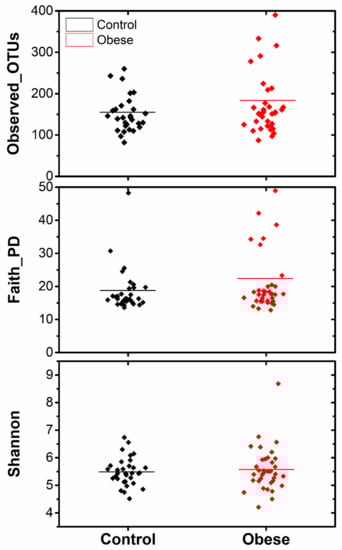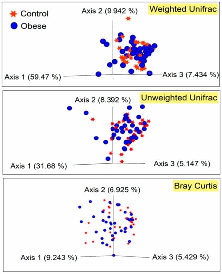 Figure 2 depicts the alpha diversity indexes of bacterial communities in the two study groups. The Faith_PD, Shannon, and observed_OTUs indexes were utilized to determine taxonomic diversity (species richness and evenness) within the samples. None of the diversity measures significantly differed between the obese and the control groups (Kruskal–Wallis p ≥ 0.05). Similarly, weighted_unifrac distance matrix-based PCoA plots showed that no distinct clustering pattern was present between the microbiome of the study samples (Figure 3). The Permutational multivariate analysis of variance (PERMANOVA) tests applied in beta diversity indexes did not show significant differences (PERMANOVA p = 0.37) among the studied groups.