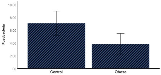 A bar chart of the estimated means of the Firmicutes/Bacteroidetes ratio and Fusobacteria in the control and obese groups after adjusting for triglycerides, insulin and HBA1c. Data are presented as the mean (95%CI).