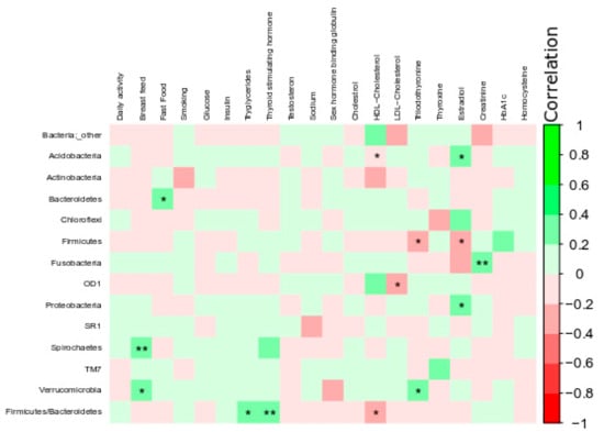 We performed a correlation analysis between demographic data and the microbiome at the phylum level. It was observed that the phylum Firmicutes was negatively associated with estradiol hormone levels. The Firmicutes/Bacteroidetes ratio was positively associated with triglycerides and TSH concentrations and negatively associated with HDL cholesterol. However, no correlation between microbiome diversity and BMI, plasma glucose, or Hb1Ac was observed. Therefore, to observe the predictors of microbiome change, the subsequent analysis of microbiome association was performed without consideration of confounding factors. The regression model indicated that regardless of BMI, estradiol and HDL cholesterol were the best predictors of Acidobacteria, whereas estradiol, HDL cholesterol, and triiodothyronine were the best predictors of Firmicutes. The model also revealed that creatinine was the best predictor of Fusobacteria regardless of BMI. These phyla are associated with host metabolism and energy harvest and, therefore, may support obesogenic phenotype and IR []. Previously, similar observations were reported by Si et al. (2017), who researched the oral microbiome when exploring biomarkers of metabolic syndrome and reported a linear correlation of HDL cholesterol and triglycerides with members of the phyla Firmicutes and Proteobacteria [].
