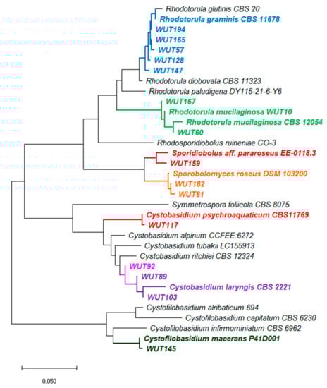 In phylogenetic studies of yeast isolates five main groups were recognised. In the first group, there are five strains directly related to genus R. graminis (marked in blue). These strains show slight differences in nucleotide sequences on a common fragment, and between strains WUT194, WUT165 and WUT57 only a six nucleotide (nt) divergence was estimated, whereas between WUT194, WUT128 and WUT147, 5 nt and 7 nt, respectively. The second group comprises of strains related to R. mucilaginosa species (marked in green). The highest difference in nucleotide sequence (10 nt) was determined between WUT60 and WUT167, whereas between WUT60 and WUT10 variance in only 6 nt was denoted. Next three strains, WUT159, WUT181 and WUT61, formed individual branches with one direct homologue and were assigned into Sporidiobolus pararoseus and Sporobolomyces roseus species. In the fourth cluster, there were located strains WUT117, WUT89, WUT103 and WUT92 of Cystobasidium genera. In the case of WUT92, phylogenetic analysis did not allow to clearly assign this isolate to the species. It cannot be excluded that WUT92 is a representative of new species, but more complex analysis is required.