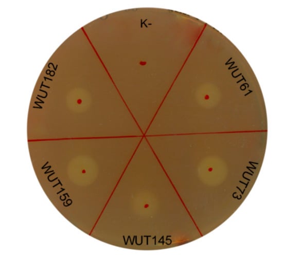 Although many enzymes with industrial applications are produced using yeasts [,,], new and safe sources of enzyme preparations are still being sought. Therefore, the ability of newly isolated strains to produce extracellular enzymes was also verified (Table 2). Several yeasts have been described as lipase producers, and among them species of the genus Candida are the most commercially used ones []. However, lipase-producing basidiomycetes species have also been isolated and characterized [,,,,,]. In accordance with recent reports, in this study most of the strains were able to synthesize lipases and gave positive results in the plate tests (Table 2 and Figure S1), w hereas, a proteolytic activity was only demonstrated for Cystofilobasidium macerans WUT145 (Figure S2). Till now only one paper has described protease production by yeast from the Cystofilobasidium genus [], however, other cold-adapted yeasts belonging to basidiomycetes were previously characterized as potential protease producers [,]. Additionally, within the tested strains, four of them, Sporobolomyces roseus WUT61, C. macerans WUT145, S. pararoseus WUT159 and S. roseus WUT182, produced clear positive results for cellulolytic activity in the plate test (Figure S3). It is worthwhile noting that the authors are un aware of any works evaluating the potential of Cystofilobasidium or Sporobolomyces species for cellulases production, and little has been published about R. glutinis with cellulolytic ability [].