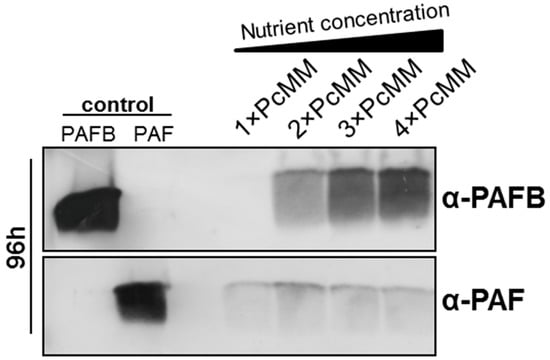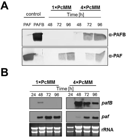 In comparison to PAFB, PAF was strongly induced in 1× PcMM under nutrient starvation, as reported earlier [34]. However, PAF expression was mildly repressed under nutrient excess (4× PcMM) compared to the limiting conditions, but still present in sufficient amounts. This observation points towards a more complex regulation, excluding nutrient starvation to be the only trigger for PAF expression as assumed so far [6,25] (Figure 2, Figure 4).