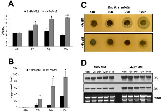 Parameters reflecting the fungal fitness under pafB-inducing and noninducing conditions. P. chrysogenum wt was grown in 1× PcMM and 4× PcMM at 25 °C, respectively. Samples were taken after 48, 72, 96 and 120 h to monitor biomass, extracellular protein and penicillin production. Expression of genes coding for ribosomal protein S5 and S6 was analyzed up to 144 h. (A) Fungal biomass: Biomass is indicated as gram dry weight per liter (DW g/L). Values are given as mean ± SD (n = 3). (B) Extracellular protein production: Secretion of extracellular proteins is indicated as mg protein per liter culture broth (mg protein/L broth). Values are given as mean ± SD (n = 3). (C) Penicillin production: Penicillin production was tested on B. subtilis. The amount of culture broth tested, was related to the dry weight of the biomass. Plates were evaluated after 24 h of incubation (D) Northern blot: mRNA expression of ribosomal proteins S5 and S6. Ten μg total RNA per lane were loaded on a 1.2% denaturing agarose gel, blotted and hybridized with S5 and S6 specific DIG-labelled probes, respectively. Ethidium bromide-stained rRNA (26S and 18S) is shown as loading control. P-values in (A,B) were determined to compare the biomass production and the extracellular protein level between 1× PcMM and 4× PcMM conditions, respectively. * p ≤ 0.05, *** p ≤ 0.0005.