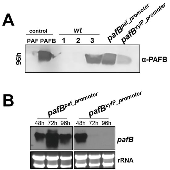 Comparison of PAFB and PAF expression on mRNA and protein level in P. chrysognum wt under low nutrient (1× PcMM) and nutrient excess conditions (4× PcMM). (A) Western blot: Samples were taken after 48, 72 and 96 h of cultivation at 25 °C. Culture supernatants (25 μL per lane) were loaded on a 18% (w/v) SDS polyacrylamide gel and size fractionated proteins were transferred on a nitrocellulose membrane. A polyclonal antibody (α-PAFB or α-PAF) was used for specific PAFB and PAF detection in a 1000-fold dilution. As control, 1 µg purified PAFB or PAF were loaded. (B) Northern blot: Samples to monitor mRNA expression were taken after 24, 48, 72 and 96 h of incubation at 25 °C. Ten μg total RNA were loaded per lane on a 1.2% denaturing agarose gel, blotted and hybridized with a pafB or paf-specific digoxigenin (DIG)-labelled probe. Ethidium bromide-stained rRNA (26S and 18S) is shown as loading control.