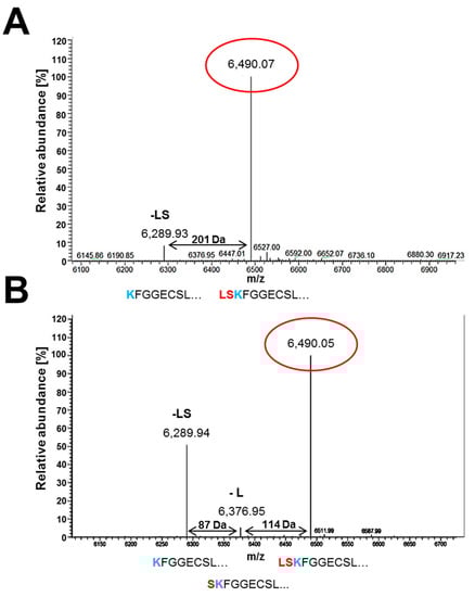 Electrospray ionization mass spectrometry (ESI-MS) analysis of purified PAFB from (A) P. chrysogenum wt and (B) pafBpaf_promoter mutant. The x-axis represents the ratio between mass and charge and the y-axis represents the relative abundance of isotopes. The masses correspond to the different N-terminally truncated PAFB forms: the full length (6490.03 Da), the truncated form lacking the amino acid leucine (6376 Da, -L) and the truncated variant lacking two amino acids leucine and serine (6289.91 Da, -LS), respectively. The aa sequences below the peaks represent the N-terminus variations of PAFB.
