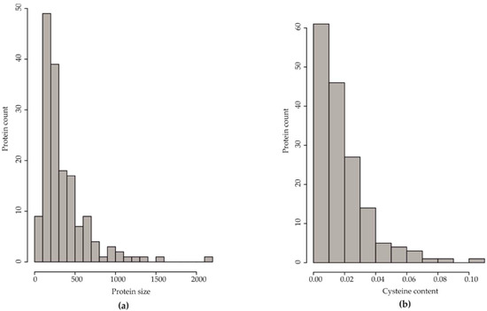 Among the 163 effector candidates, 97 candidates (59.5%) contained less than 300 aa, with the largest group containing 100–200 aa (49 candidates), followed by those between 200 aa and 300 aa (39 candidates). The number of proteins with the size between 300 to 400 aa was approximately equal to those of size 400–500 aa, 18 and 17 candidates, respectively. Only a small number of proteins (24 candidates) had the length of 500–1000 aa, making up 14.7%. Only seven candidates had over 1000 aa, as seen in Figure 1a. Apart from the protein size, the percentage of cysteine residues is one of the discriminative features in effector classification [15]. We found 61 out of 163 proteins had ≤1% cysteine (one cysteine residue per 100 aa), with 26 proteins without cysteine residues, as seen in Figure 1b, Table S2B. The proteins containing 1–2%, 2–3%, and 3–4% cysteine residues (46, 27, 14 out of 163, respectively), together with ≤1% cysteine residue proteins, comprised nearly 90% of the effectome.
