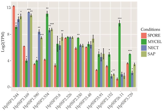 Transcriptome profile of HpSSP-coding genes from free-living mycelia (MYCEL), saprotrophic sawdust growth (SAP), necrotrophic growth in the necrotic wood tissue (NECT), and conidiospores (SPORE). Error bars represent the SD from three independent experiments. Asterisks indicate significant difference from the level under SPORE condition (*** p < 0.001; ** p < 0.01; * p < 0.05).
