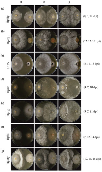 Mycelial interaction between H. parviporum (left side of Petri plates) and other fungi (right side of the plates) in paired cultures. Mycelia from the paired cultures were collected at precontact (t1), initial contact (t2), and postcontact (t3). (a) Self-interaction between H. parviporum (HpHp), both pre- and initial contact (t1 and t2) with H. parviporum occurred at 8 days postinoculation (dpi), t3 = 19 dpi. (b) Overgrowth during interaction between H. parviporum and C. gentilis (HpCg). Mycelia collection at t1, t2 (12 dpi), and t3 (16 dpi). (c) Overgrowth during interaction between H. parviporum and P. sphaeroides (HpPs). t1: 8 dpi; t2: 11 dpi; t3: 13 dpi. (d) Partly replacement of H. parviporum for P. chrysosporium (HpPc). t1: 4 dpi; t2: 7 dpi; t3: 10 dpi. (e) Barrage zone formed during interaction with P. gigantea (HpPg). t1: 5 dpi; t2: 7 dpi; t3: 11 dpi. (f) Barrage zone formed during interaction with S. sanguinolentum (HpSs). t1: 7 dpi; t2: 12 dpi; t3: 14 dpi. (g) Distance during interaction with Mycena sp. (HpMy). t1: 12 dpi; t2: 14 dpi; t3: 16 dpi.