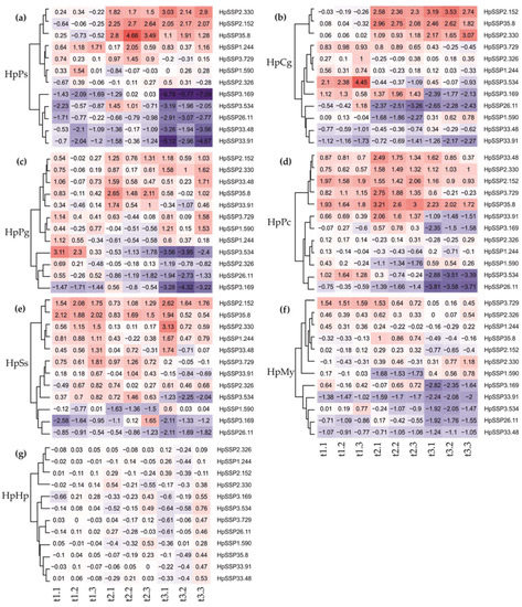During the interaction between H. parviporum and the endophyte P. sphaeroides (HpPs), we found strong regulation of the commonly expressed HpSSP individuals, compared to the combination with other wood-decay basidiomycetes, as seen in Figure 5a. Additionally, HpSSP33.48 and HpSSP33.91 were also downregulated in HpPs particularly at t3, as seen in Figure 5a, which was different from other interactions. Ectomycorrhizal C. gentilis was also replaced by the pathogen on malt extract agar, and HpCg likely shared the similar expression dynamics to HpPs, including the commonly upregulated ones (HpSSP2.330, HpSSP2.152, and HpSSP35.8), HpSSP26.11, HpSSP33.48, and HpSSP33.91, as seen in Figure 5b. HpSSP3.534 was induced at t1, while HpSSP3.169 was induced at t1 and t2, and downregulated at t3. HpSSP1.590 was inactive in HpPs, but downregulated at t2 in HpCg, as seen in Figure 5b.