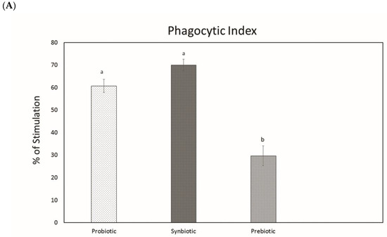 A significant increase in the phagocytic activity of the peritoneal macrophages was detected in the probiotic (60.6 ± 2.9%) and synbiotic groups (70 ± 2.5%) compared with the prebiotic group (29.6 ± 4.41%). The results are given in Figure 6A,B.