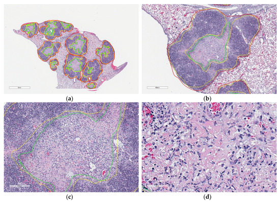 Microscopic appearances of lung granulomas with central cell-poor necrosis, and peripheral cellular and nuclear debris from a super-susceptible DO mouse infected with M. tuberculosis. Lung tissue was formalin-fixed, paraffin-embedded, sectioned at 5 μm, adhered to glass slides, stained with hematoxylin and eosin, and digitally scanned. The colored lines outline regions of interest: Granulomas (red) contain central cell-poor necrosis (green), and a layer of dense peripheral cellular and nuclear debris (yellow). (a) Lung magnified 10×. (b) Granuloma magnified 40×. (c) Central region of a granuloma magnified 100×. (d) Cell-poor necrosis magnified 400×.