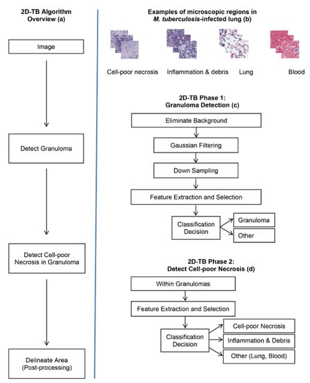 Schematic overview of 2D-TB. (a) Overview in block diagram. (b) Microscopic appearance of visually distinct regions in M. tuberculosis-infected lung: Cell-poor necrosis; inflammation and debris; normal lung tissue; and blood, magnified 400×. (c) 2D-TB phase 1: Granuloma detection in block diagram. (d) 2D-TB phase 2: Detection and classification of cell-poor necrosis within granulomas.