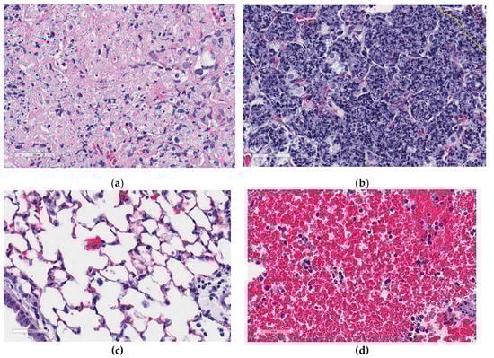 Examples of visually distinct regions from hematoxylin and eosin stained lung sections from super-susceptible M. tuberculosis-infected DO mice. (a) Cell-poor necrosis; (b) Inflammation and cellular debris; (c) Lung tissue; (d) Blood. Regions are magnified 400×.