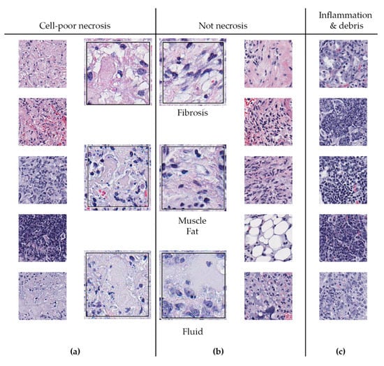 Previous approaches to distinguish necrotic from non-necrotic regions using computer-aided image analysis and machine learning algorithms can be grouped into four categories: (i) color statistics and local binary patterns [31], (ii) visual patterns [32,33,34], (iii) kernel methods [35], and (iv) neural networks [36]. Homeyer et al. [31] achieved best accuracy and computation time using color and texture features from Red Green Blue (RGB) and Hue Saturation Value (HSV) color channels. They used 4 sets of liver images and features from HSV color channels and a Random Forest classifier to obtain >88% accuracy in detecting hepatic necrosis. Cruz-Roa et al. [32] used a different approach, extracting visual patterns from normal and necrotic tissues using a bag of features-based codebook. This codebook comprises of luminance values of block pixels, series of difference of Gaussian filters, and Discrete Cosine Transform. They used bi-clustering analysis to identify and associate code words with conceptual classes and then selected the most discriminative code words. Han et al. [35] compared the performance of sparse coding with classical kernel methods to classify normal brain tissue, cancer, and necrotic tissue. They found kernel methods performed better than sparse coding with respect to their database. Finally, several studies used neural networks to identify necrosis. For example, Han, Nayak et al. [36] decomposed histopathologic images into distinct areas by using a variation of Restricted Boltzmann Machine to classify patches from the National Institutes of Health’s Cancer Genome Atlas Archive, achieving accuracy >81% on two different databases. In a follow-up study, Chang et al. [33] used morphometric features and morphometric sparse code algorithms within the Spatial Pyramid Matching framework for classification of necrosis. They found that modeling the context of the morphometric information outperforms algorithms based on pixel or patch features. More recently, Chang et al. [34] proposed an unsupervised multi-stage feature learning algorithm to detect normal tissue, cancer, and necrosis. They used stacked Predictive Sparse Decomposition at different locations and scales, followed by a linear SVM classifier to “diagnose” two cancer types. Performance was highly promising at >91.89% accuracy on 2 publicly available cancer databases.