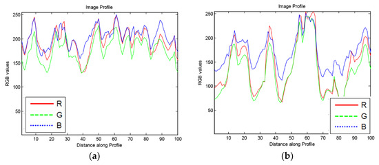 The intensity value of a pixel is defined by performing weighted sum of the R, G, and B color channel components (Equation (5)) that is commonly used for grayscale conversion.