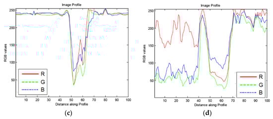 To avoid detecting regions that may be confused with cell-poor necrosis (Figure 6), we obtained 100-pixel horizontal image profiles from different regions and examined the color profiles. Figure 7 shows representative profiles. In regions of cell-poor necrosis (Figure 7a), R, G, and B color channel values are close to each other with generally higher and less B color channel than the values of inflammatory cells and nuclear debris (Figure 7b). In Figure 7c, the lung tissue R, G, B color channel values are close to each other and have relatively high values (e.g., 230). As expected, in areas with blood cells (Figure 7d), the R color channel values are higher than G and B color channel values.