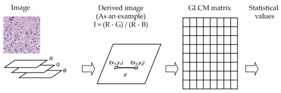 Linear kernel SVM, Gaussian kernel SVM and decision trees were evaluated to differentiate cell-poor necrosis from inflammatory cells and nuclear debris and from other types of cells/regions in lung tissues. We trained a learning model to identify three different classes: Cell-poor necrosis; Inflammatory cells and nuclear debris; and ‘Other’ (i.e., normal lung, fibrosis, fluid-filled alveoli, fat, smooth muscle, and blood) using color features as previously described, and texture features. To exploit texture information, statistical values of horizontal gray level co-occurrence matrices (GLCM) [11,12] of derived images were used. The texture information was obtained from both GLCM and statistical values of derived images I. Relative frequency matrix of two separate neighbors at certain pixel distance d was calculated. GLCM matrices are constituted in only one angle (zero degree) with a function of distance d to reduce computation times. Figure 8 and Table 1 show the feature definitions and 10 statistical features extracted from derived images and the average and standard deviation features calculated from derived images.