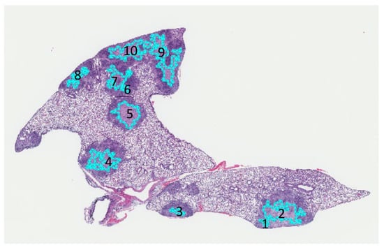 Figure 9 shows output by 2D-TB to automatically detect and mark 10 different cell-poor necrotic regions within M. tuberculosis granulomas on one section of hematoxylin and eosin stained lung. Table 5 shows the written feedback from a board-certified pathologist (GB) for each region.