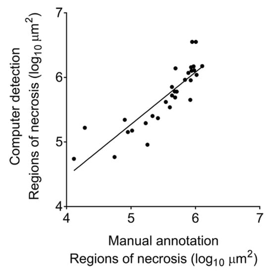 Figure 10 demonstrates the very strong, positive, statistically significant correlation (Spearman r = 0.93, p < 0.0001) between the area (μm2) of 30 different regions of cell-poor necrosis within granulomas that were automatically detected by 2D-TB and the same regions manually annotated by a board-certified veterinary pathologist (GB).