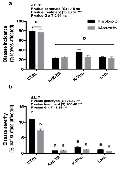 - Pugliese, M.; Monchiero, M.; Gullino, M.L.; Garibaldi, A. Application of laminarin and calcium oxide for the control of grape powdery mildew on Vitis vinifera cv. Moscato. J. Plant Dis. Prot. 2018, 125, 477–482. [Google Scholar] [CrossRef]