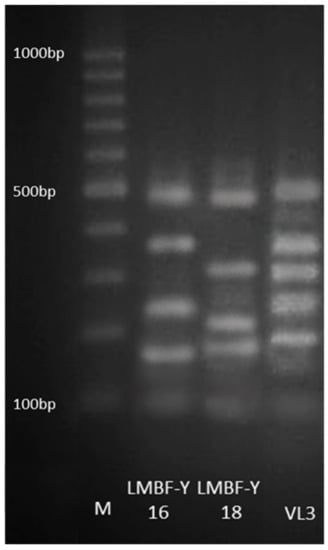 Electrophoretical patterns obtained for the two tested yeast strains, LMBF-Y16 and LMBF-Y18, with delta12–delta21 primers. The commercial Saccharomyces cerevisiae strain VL3 (Laffort) was used as a positive control. A 100 bp DNA ladder marker (BioRad) served as the size standard.