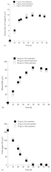 To further demonstrate the repeatability of the performed trials, one experiment (S. cerevisiae LMBF-Y 16 growing on media composed of sugar-enriched grape must with initial total sugar concentration adjusted to approximately 220 g/L; Figure 2) was repeated three consecutive times, and the results concerning biomass (DCW) production, ethanol biosynthesis, and consumption of total sugars, illustrated in Figure 2, demonstrated satisfactory repeatability.