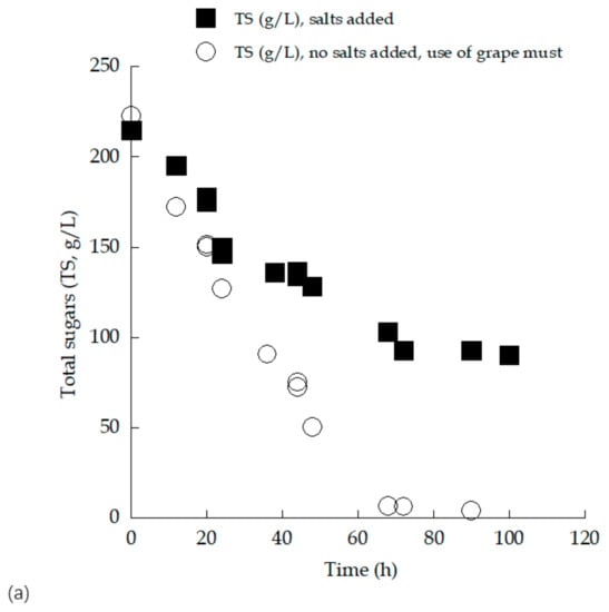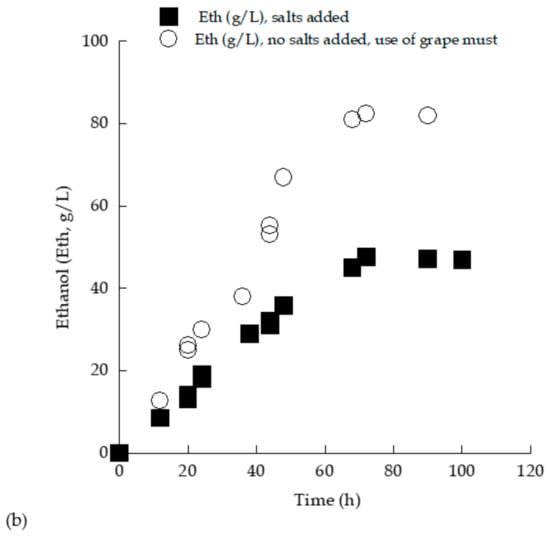 From the kinetic results demonstrated in Table 1, it can be seen that in the trials performed in the (sugar-enriched) grape must, noticeably higher quantities of sugars were assimilated, and significantly higher ethanol quantities were produced compared with the trials performed in the glucose-based synthetic medium. On the other hand, synthesized glycerol quantities in absolute values (g/L) were almost equal in both trials (approximately g/L), although in the synthetic glucose-based culture, noticeably lower sugar quantities had been assimilated compared with the grape must experiment. Comparisons of the kinetics of sugars assimilated and ethanol produced are shown in Figure 3.