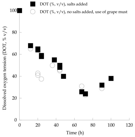 Evolution of dissolved oxygen tension (DOT, % v/v) during growth of Saccharomyces cerevisiae strain LMBF-Y 16 on either glucose-based, salt-enriched synthetic media or sugar-enriched grape must with initial total sugar concentration ≈ 220 g/L. Each point is the mean value of two independent measurements (SE < 15%).