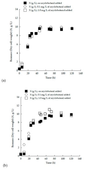 The presence of fungicides was expected to have a negative effect on microorganisms’ growth [58]. However, in the present study, the presence of the myclobutanil fungicide had a favorable effect on the growth of both yeasts. A similar observation was documented by Sarris et al. [30], in which S. cerevisiae MAK 1, cultured in shake-flask experiments on sugar-enriched pasteurized grape must, produced biomass at a concentration of approximately 8 g/L, while the addition of quinoxyfen fungicide resulted in yeast biomass content increasing up to a value of 9.5 g/L [30]. Similarly, there have been many documented cases where the addition of constituents that in theory would exert an inhibitory effect increased or maintained the concentration of biomass rather than reducing it [25,59]. To conclude, a thorough investigation targeting the effect of pesticides on each specific strain in order to elucidate the optimum combination is needed for each specific application. The kinetics of yeast DCW production vs. the culture time for the strain S. cerevisiae LMBF-Y 18 growing on (enriched) grape musts supplemented with 0.0 (control experiment), 0.1 and 1.0 mg/L of myclobutanil (Figure 5) demonstrated that the added biocide did not result in alteration of cell growth by the strain. Interestingly, at higher TS0 concentrations, the addition of myclobutanil seemed to stimulate yeast biomass production (Figure 5b).